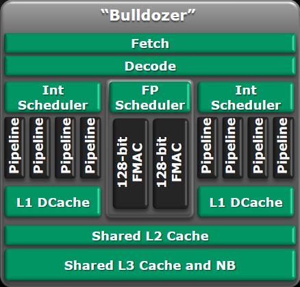 Um módulo Bulldozer consiste de dois núcleos inteiros com um total de 213 milhões de transistores, contando com algumas partes do chip compartilhadas entre si. Isso poupa muitos transistores mas pode gerar alguns problemas adicionais, como mais calor.