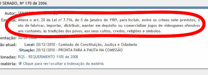O que decreta a ilegalidade de praticamente todos os jogos, os games estariam proibidos de serem vendidos no país, pois todos têm, de alguma forma, alguma ofensa à costumes, tradição, religião ou símbolo de algum povo. Isso sem contar o fato de que a avaliação do que é ou não uma ofensa é algo extremamente delicado e particular. O movimento para que sejam tomadas providências contra este projeto estão centralizadas no site no site gamer point neste link: http://www.gamerpoint.com.br/2010/12/perigo-para-a-comunidade-gamer-brasileira/ Aproveitando o gancho vamos ver o que eu encontro aqui no google a respeito deste tal Senador, vamo lá….