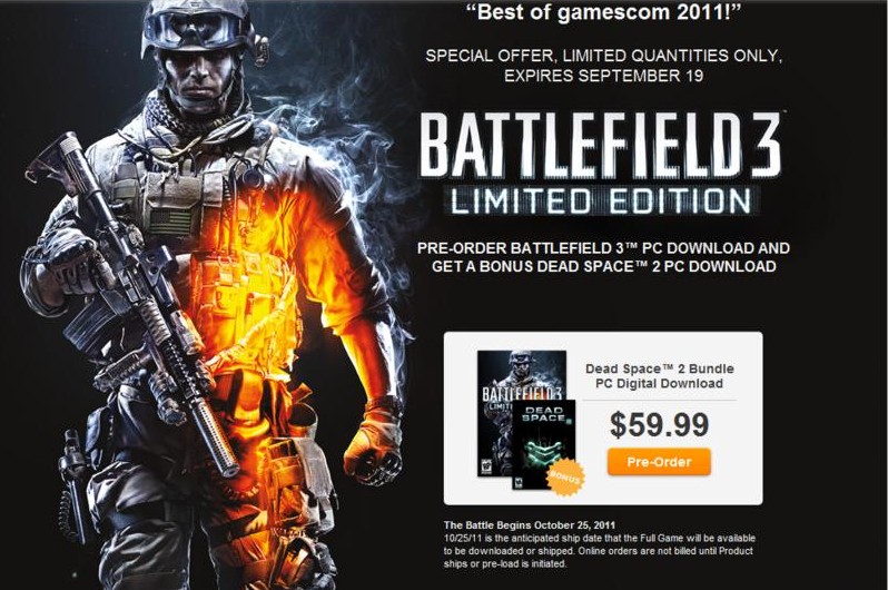 Os jogadores que adquirirem a Edição Limitada de Battlefield 3 para PC pré compra receberão além dos acessórios agora também receberão uma cópia grátis de Dead Space 2, um jogo que recebeu ótimas criticas da imprensa. Costuma-se dizer que “quando a esmola é grande, o santo desconfia” (ou algo assim) mas neste caso pode haver uma explicação mais plausível. Para quem não se lembra, o estúdio Visceral, responsável por Dead Space 2 foi fechado recentemente o que pode justificar tal promoção.