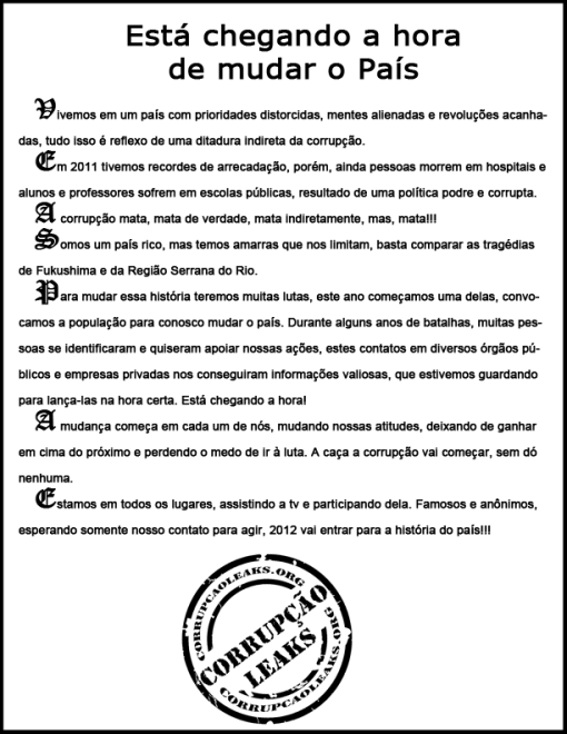 O site surge com o intuito de reunir arquivos e documentos de denuncias, o grupo deixa bem claro que devem ser enviadas apenas denuncias com provas e documentos que não chegaram a público e pedem para que não os enviem links de notícias sobre fatos. Isso nos leva a crer que o site não tem a intenção de ser um portal de reclamações mas sim algo como o WikiLeaks. O trabalho parece ser sério, aqueles que possuem denúncias para o site mas são exigidas provas concretas sobre os casos, aqueles que quiserem permanecer anônimos podem utilizar o serviço chamado AnonMail onde o remetente permanece oculto. O site está disponível através do endereço http://www.corrupcaoleaks.org/. A iniciativa é boa mas será que funciona, apenas a população poderá responder. Seriam eles os novos caras pintadas?