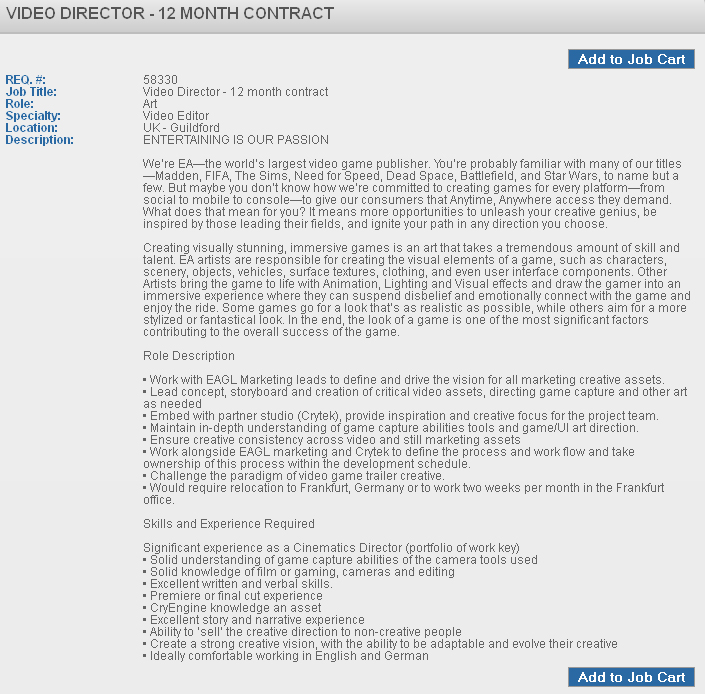 Sem DLC’s ou grandes novidades Crysis 2 continua pacatamente atendendo a seus fãs que ainda não parecem estar ansiosos por uma sequencia mas isso não quer dizer que EA e Crytek não estejam pensando no assunto ou mesmo trabalhando nisso. Uma proposta de emprego para a função diretor de vídeo revelou que as empresas estão trabalhando conjuntamente em um projeto onde o motor gráfico será o CryEngine porém, as informações param por ai, nenhuma pista sobre o jogo é revelada.