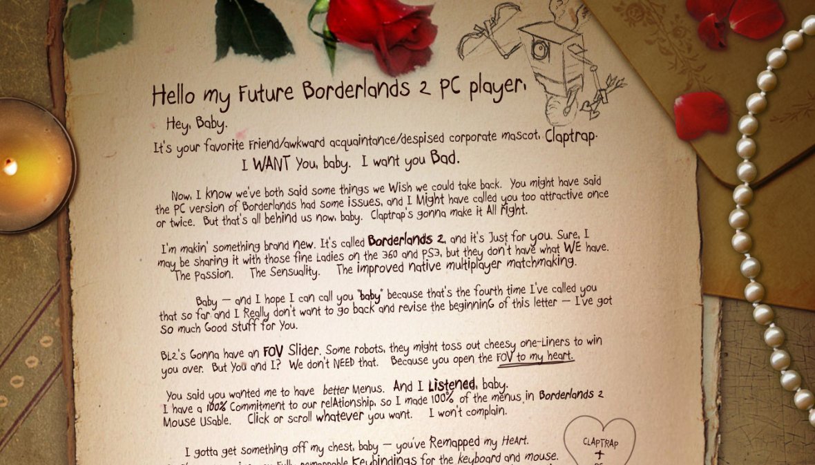 Na carta o estúdio promete amorosamente uma versão 100% compatível com mouse e teclado, incluindo os menus. Apesar de admitir uma quedinha pelo PS3 e X360 a versão para PC sera tratada com muito amor, gravação em Cloud, suporte para Lan, modos Offline e lista de amigos, ajuste para o campo de visão, comandos remapeáveis para teclado e mouse, achievements e suporte para alta resolução são algumas das promessas. Borderlands 2 será lançado em 17 de setembro, com versões para X360, PC e PS3.
