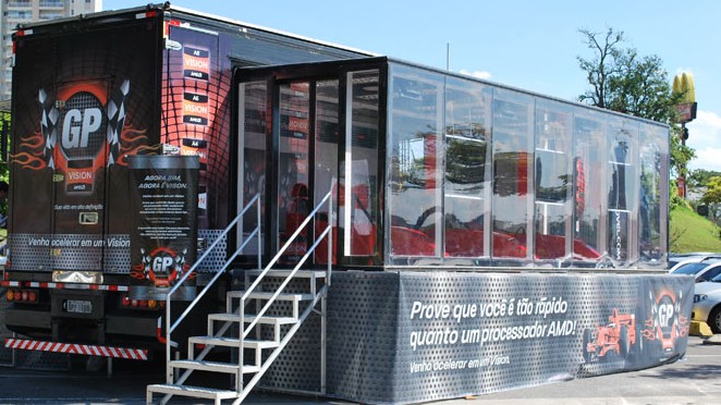 Desde que implementou um novo modelo de identificação dos seus produtos com os selos Vision, a AMD vem buscando esclarecer as frequentes dúvidas do consumidor, mas explicações podem ser confusas então a empresa encontra meios práticos de apresentar os seus produtos, com um caminhão, por exemplo. Calma, não é o que você pode ter imaginado (seja lá o que imaginou), se trata de um caminhão que conta com três simuladores de carros de Fórmula 1 da Ferrari, com o mesmo jogo utilizado para treinamento dos pilotos profissionais. O objetivo é permitir que, com isso, a população em geral participe de corridas virtuais, que acontecem a cada 30 minutos. Em cada etapa, o corredor que completar o percurso no menor tempo possível vai ganhar um presente exclusivo.