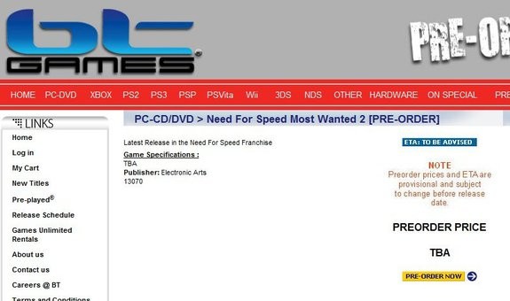 A página de uma loja de jogos da África do Sul, a BTGames, revelou o jogo Need For Speed Most Wanted 2 como pre-order mas desacompanhado de qualquer informação como plataformas ou data de lançamento. A mesma loja revelou recentemente o jogo Dead Space 3, os dois títulos sem nenhuma confirmação ou comentário por parte da EA. Se Most Wanted 2 estiver realmente em produção ele pode ser o próximo jogo em que os estúdios Criterion, responsáveis por Need for Speed: Hot Pursuit (2010), estão trabalhando, portanto, podemos ficar mais tranquilos com o futuro da série não é mesmo?