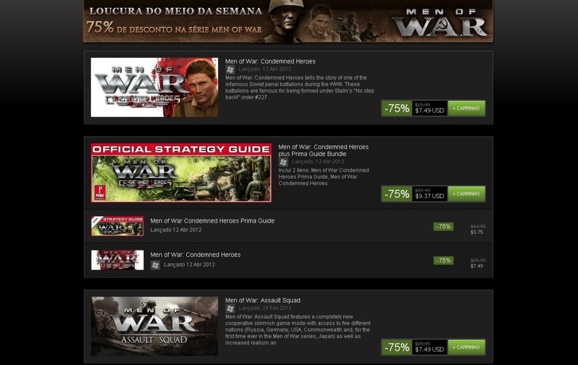 Sugestões de como gastar seu tempo livre nessas férias é o que não falta, as promoções estão acompanhando o seu “vale” de meio de mês e o Steam traz a série Men of War com 75% de desconto na loucura de meio de semana, todos os títulos da série e seus DLCs estão em promoção. Men of War é uma série de jogos de Estratégia em Tempo Real impressionante que ocorre durante o auge da Segunda Guerra Mundial (com uma passagens pela Guerra do Vietnã com Men of War: Vietnam). Você pode controlar as forças Soviéticas, aliadas ou forças alemãs em 19 grandes missões single-player e partidas multiplayer.