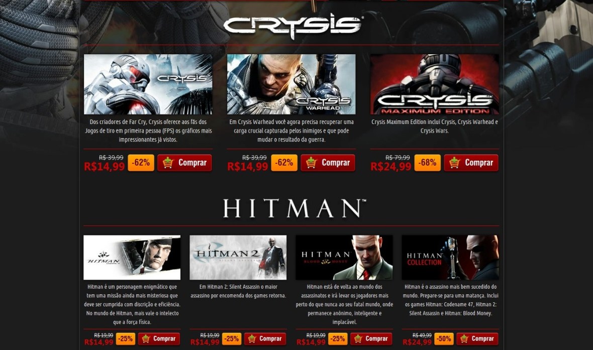 Além dos games individuais você pode optar por Crysis Maximum Edition (que inclui Crysis, Crysis Warhead e Crysis Wars) e Hitman Collection (que inclui Hitman: Codename 47, Hitman 2: Silent Assassin e Hitman: Blood Money) por R$ 24,99 cada. Para mais informações visite a página da promoção no site (aqui) e aproveite, a oferta dura apenas neste final de semana somente para PC.