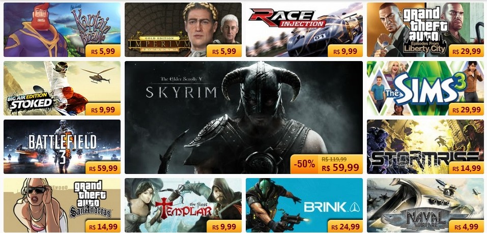 Vários games estão em promoção com descontos superiores 70% e semanalmente alguns deles recebem um desconto maior, esta semana temos como destaque Skyrim (de R$ 119,00 por R$ 59,99), GTA IV: Episodes ( de R$ 49,99 por R$ 29,99), BF3 (de R$ 119,00 por R$ 59,99), Brink (de R$ 49,99 por R$ 24,99), The Sims 3 (de R$ 69,99 por R$ 29,99) e Homefront (de R$ 49,99 por R$ 14,99) entre outros, que estão com preços excepcionais durante esta semana. Na Nuuvem você pode optar pelo pagamento digital, boleto bancário ou cartão de crédito, como disse nosso amigo do vídeo, tudo em Real, nada de Dólar. Para visualizar os jogos em promoção e obter mais informações visite a página da Nuuvem (aqui) e fiquem ligados, estaremos atualizando as promoções no Lock.