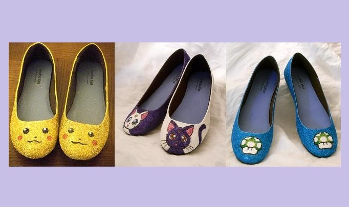 Que a moda Geek está por todos os lados não é novidade, hoje há um incalculável número de opções de acessórios e vestimentas que enxeriam um guarda roupa completo para quem curte esse estilo, os temas variam de acordo com o gosto de quem usa e entre os mais “famosos” encontram-se Star Wars, Mario Bross, Pokémon e (o que eu acredito ser mais comum) os Heroes de HQ. E seguindo a tendencia, a Aisha Voya Creations desenvolveu essas sapatilhas cobertas de Glitter inspiradas nessa moda trazendo figuras conhecidas como por exemplo o cogumelo “Level Up” do Mario World.