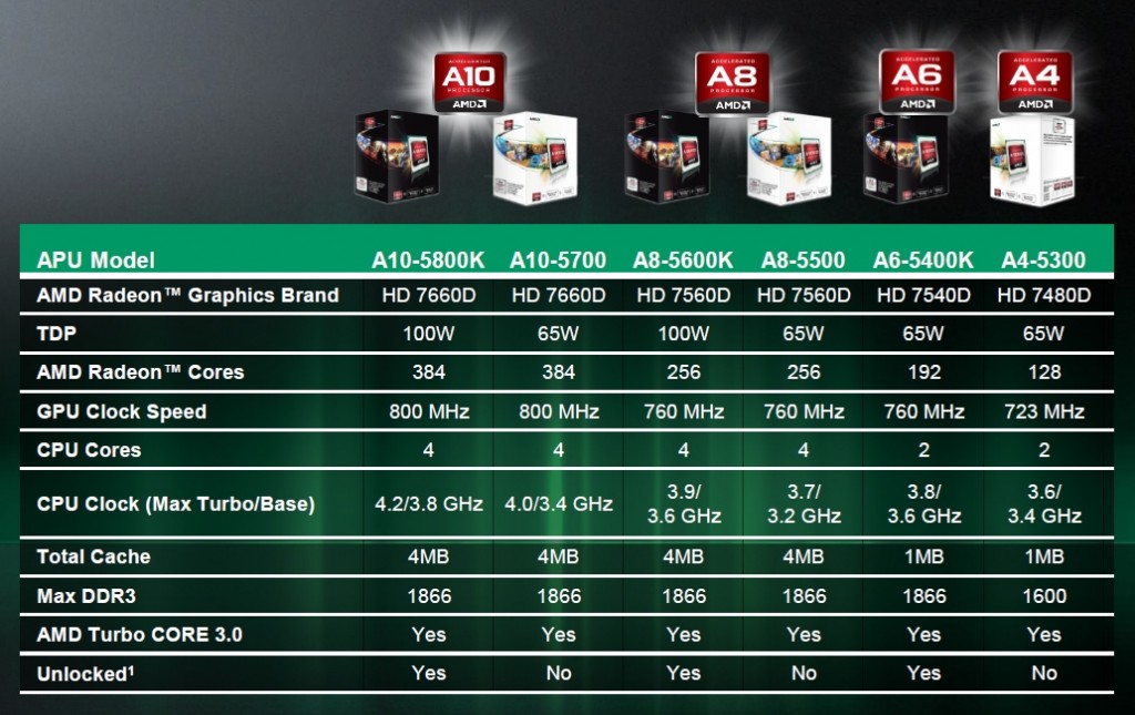 Enquanto as APUs da geração Llano tinham o A8 3850 como o top de linha a linha Trinity tem o A10 5800K como o mais potente. As APUs são identificadas por letras e números que as classificam de acordo com seu desempenho como C-50 e E-450, na série “A” temos o A4, A6, A8 e A10 sendo de forma crescente o A4 o mais modesto e o último, o A10, o mais potente.
