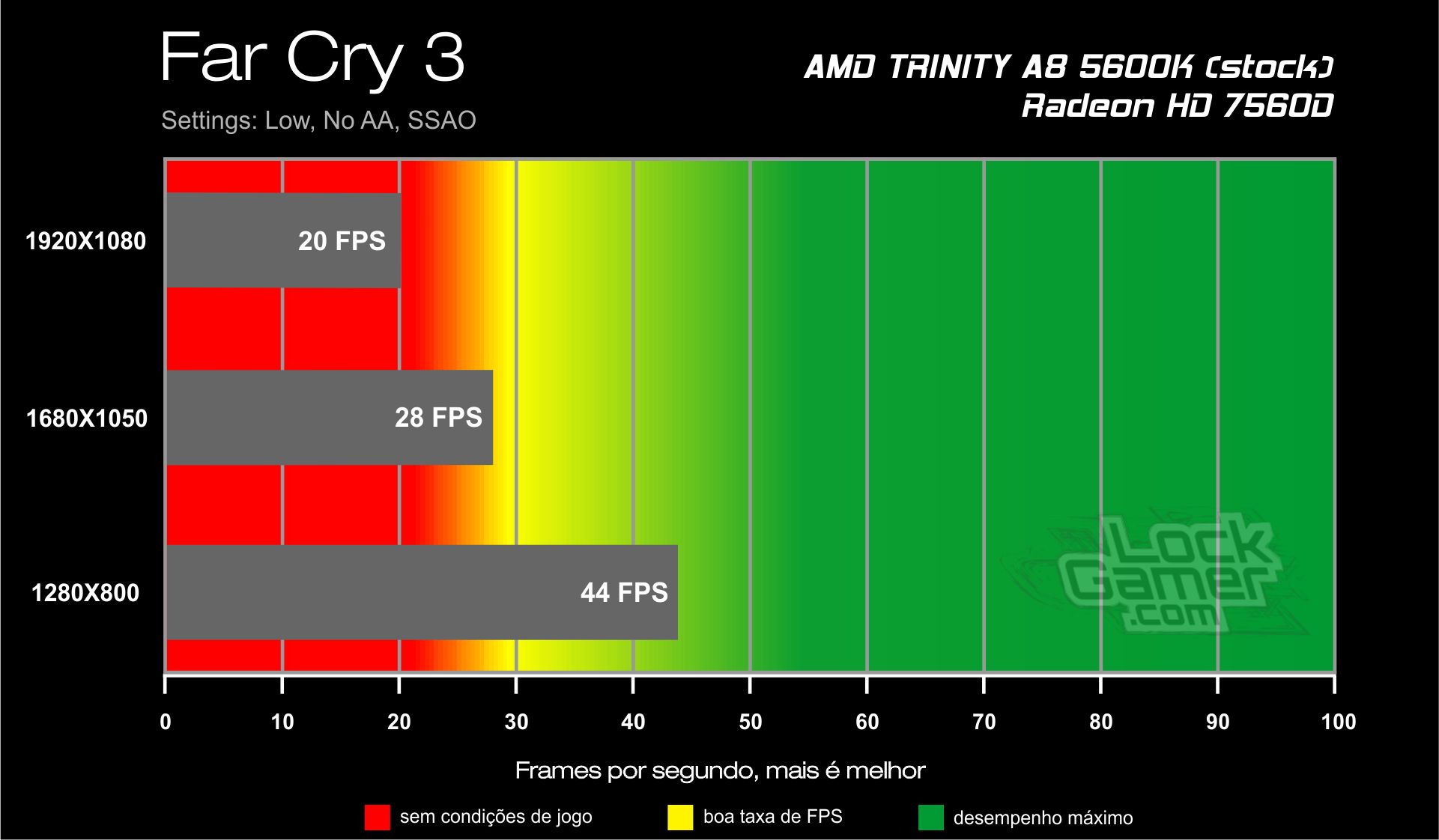 Entendemos que a média mínima de FPS aceitável para que a experiência de jogo não seja prejudicada é de 25 FPS, abaixo disso se torna praticamente impossível jogar, mas você deve prestar muita atenção antes de julgar o desempenho do produto testado, pois mesmo quando ele não é capaz de obter uma média acima de 25 FPS não significa que o desempenho foi ruim pois as placas de baixo custo, por exemplo, nem sempre são desenvolvidas para rodar os jogos em altas resoluções ou com detalhes no máximo e sacrificam um pouco do desempenho em favor do baixo custo.
