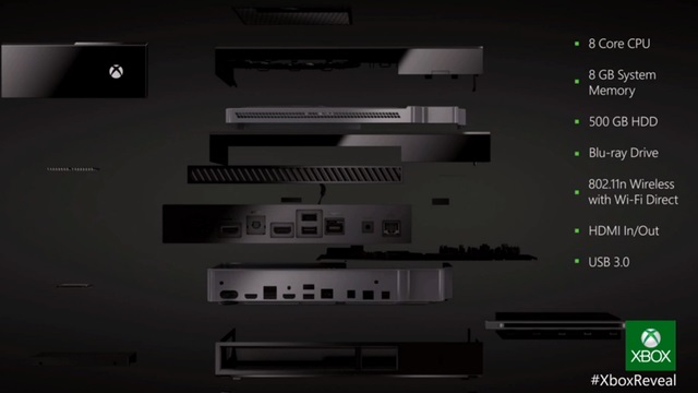As especificações de hardware do Xbox One ficaram muito próximas do que os rumores sugeriam e, consequentemente, parecidas com a do PlaySation 4. Ele traz uma CPU de oito núcleos baseado na arquitetura x86 (assim como os PCs), abandonando a arquitetura utilizada no Xbox 360, igualando as plataformas da próxima geração e facilitando o desenvolvimento de games. As especificações se completam com 8GB de RAM DDR3 (contra os 8GB DDR5 do PS4), HD de 500 GB, conexão USB 3.0 e uma GPU Direct X 11.1 com capacidade de 1.2 Tflops (contra 1.84 Tflops do PS4). A adoção do Blu-ray também é uma das novidades que além de esperada era necessária.