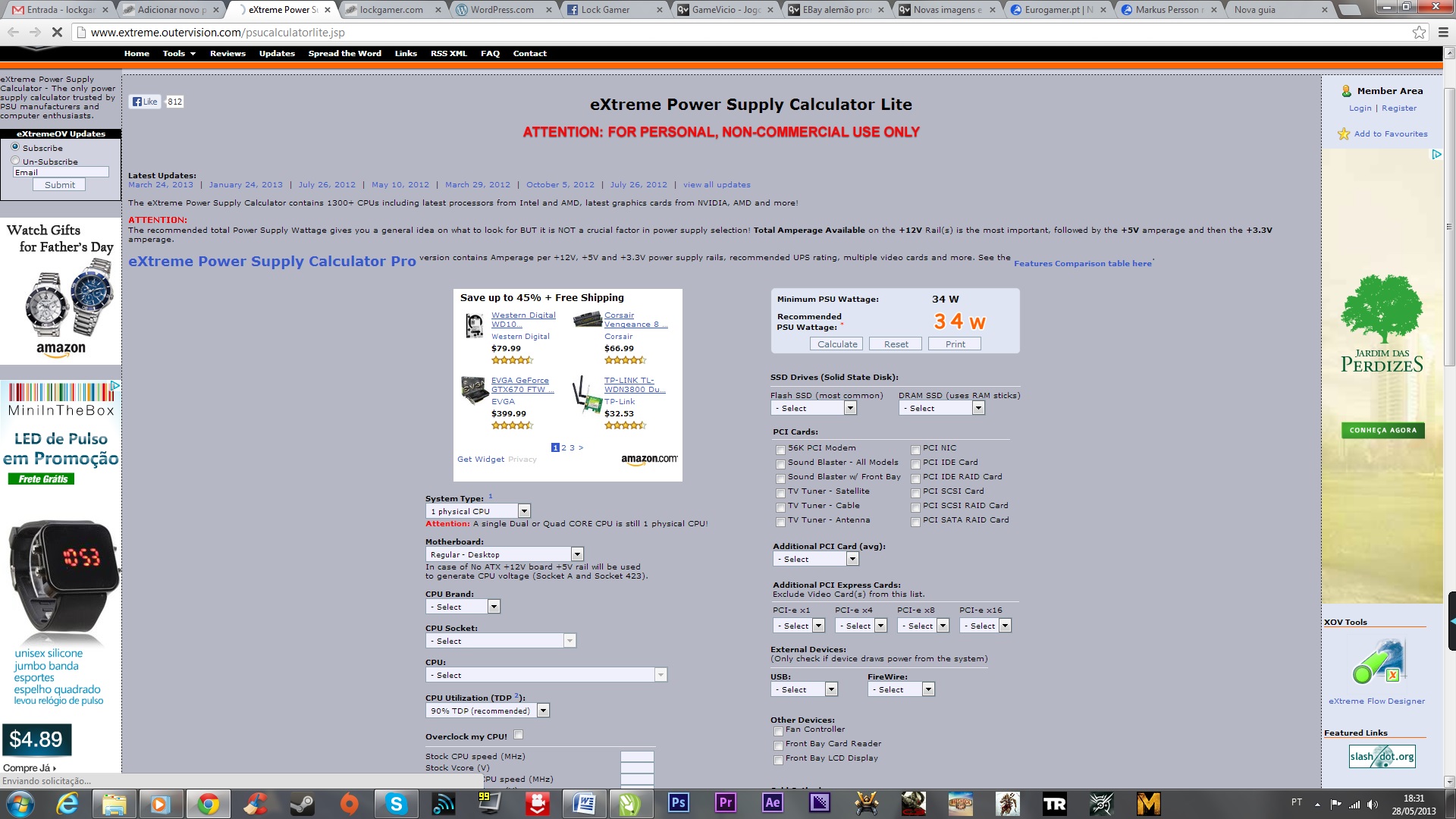 Para calcular você deve preencher os campos do formulário de acordo com a sua configuração como processador, placa de vídeo, HD, memória e coolers. Um cuidado básico é no campo do processador escolher apenas 1 CPU, mesmo que seu PC seja, dual, quad ou octa core. Caso tenha dificuldades com o inglês basta utilizar o google tradutor e tirar as dúvidas, mas o sistema é bem intuitivo e para quem possui uma noção bem básica do inglês será fácil.