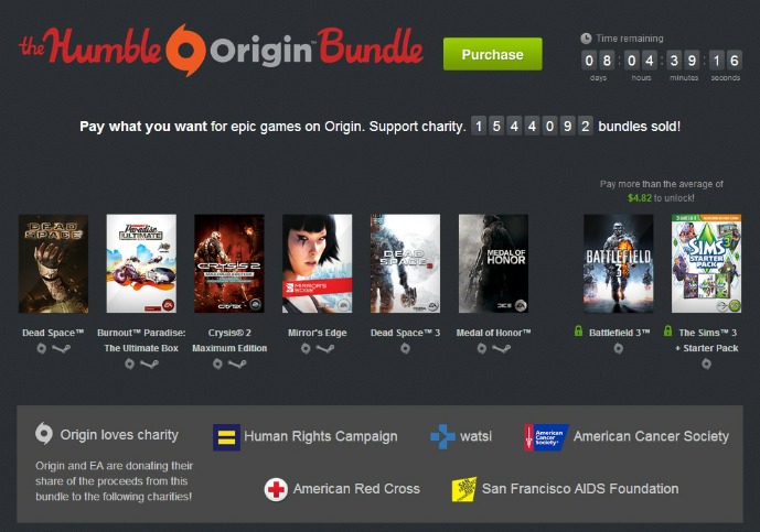 A parceria com o EA Origin criou uma das promoções mais épicas dos últimos tempos desde aquela promovida pela então quase falida THQ que oferecia grandes títulos por US$ 1 dólar mas diferente da THQ a EA vai bem, ou pelo menos não está a ponto de falir (ao que sabemos). A iniciativa é uma chance de mostrar um lado mais “humano” da empresa que não anda com uma boa reputação entre os consumidores, o Humble Origin Bundle tem como objetivo arrecadar fundos para instituições de caridade e tratamento de doenças como Câncer e AIDS. Você poderá comprar alguns jogos por US$ 1 dólar ou pagar uma quantia maior do que US$ 4,82 e receber o pacote completo incluindo as trilhas sonoras e escolher para onde quer que o dinheiro seja repassado.