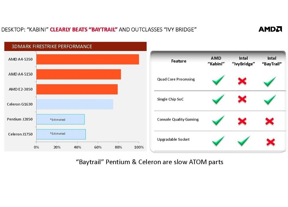 Diferente do que possa parecer, está não é uma notícia que interessa apenas para quem precisa receber um PC novo no trabalho que seja ao menos capaz de rodar um vídeo do You Tube, os processadores que já foram sinônimo de piada entre os gamers que eram menos “desprovidos de grana” pode ser uma opção até mesmo para quem pretende rodar alguns jogos. Segundo a AMD, os modelos mais potentes possuem qualidade de jogo dos consoles, ou seja, será capaz de executar jogos em configurações médias, provavelmente em HD, tudo isso gastando muito menos, algo que pode favorecer os mini PCs que começam a tomar as salas do mundo todo que poderão ser mais do que apenas um DVD/Netflix descolado, serão praticamente consoles. Isso também vale para as Steam Machine que terão um preço salgado mas com o Steam OS como sistema aberto não devem demorar a surgir alternativas bem mais baratas baseadas nesses processadores.
