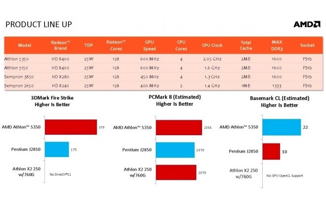 A aposta da AMD para a próxima geração de Athlon e Semprom é utilizar a mesma plataforma das APUs Kabini com modelos de 2 a 4 núcleos Jaguar com GPU e controladores embutidos no processador, eles utilizarão GPUs da série HD 8000 “discretas” com um desempenho mais modesto que os da “linha A” de APUs porém superior aos atuais Celeron, Pentium, Semprom e Athlon que dependem das GPUs (chip de vídeo) acopladas nas placas mãe. Outro conceito que vai fazer muita diferença será o baixo consumo de energia, o que também significa componentes mais baratos e menor dissipação de calor evitando a necessidade de gabinetes gigantes e coolers barulhentos.