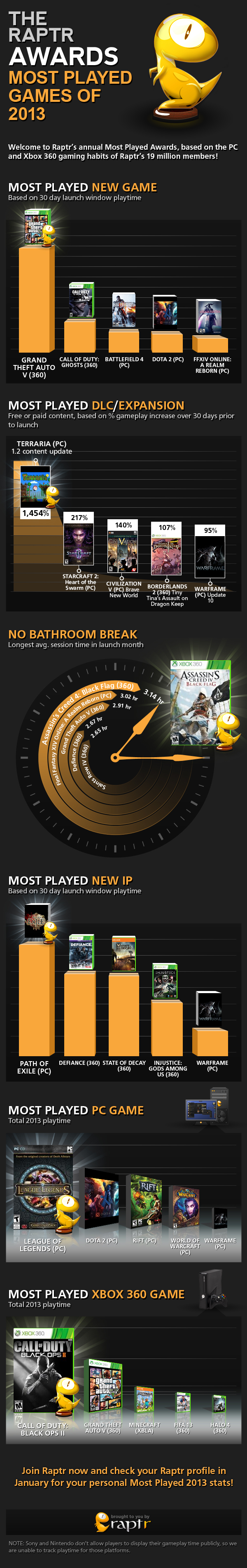 Nas plataformas, League of Legends ficou com o primeiro lugar no PC seguido pelo “rival” Dota 2, no Xbox 360 Call of Duty: Black Ops II ficou na liderança seguido por GTA V mas quem ficou com as partidas mais longas foi Assassin’s Creed IV: Black Flag com uma média superior a 3 horas de partida. É preciso observar que os consoles de Sony e Nintendo não utilizam o Raptr e nem Xbox One e PlayStation 4.