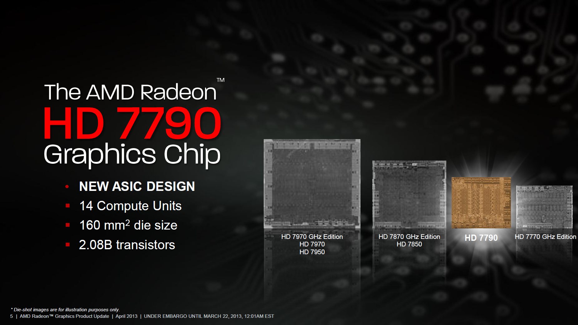 O grande diferencial da HD 7790 é com certeza o seu chip gráfico que apesar de levar o nome da série HD 7000 traz elementos e características da nova geração de GPUs da AMD que hoje estão presentes nas Radeon R9 top de linha. A tática da AMD pegou todos de surpresa já que todos se preparavam para o lançamento das novas séries de placas de vídeo mas o motivo para o lançamento foi a falta de modelos que fossem capazes de fazer frente a modelos como GTX 650 Ti contra quem a HD 7770 não possui desempenho suficiente e a HD 7850, apesar de ser capaz de supera-la, é mais cara.