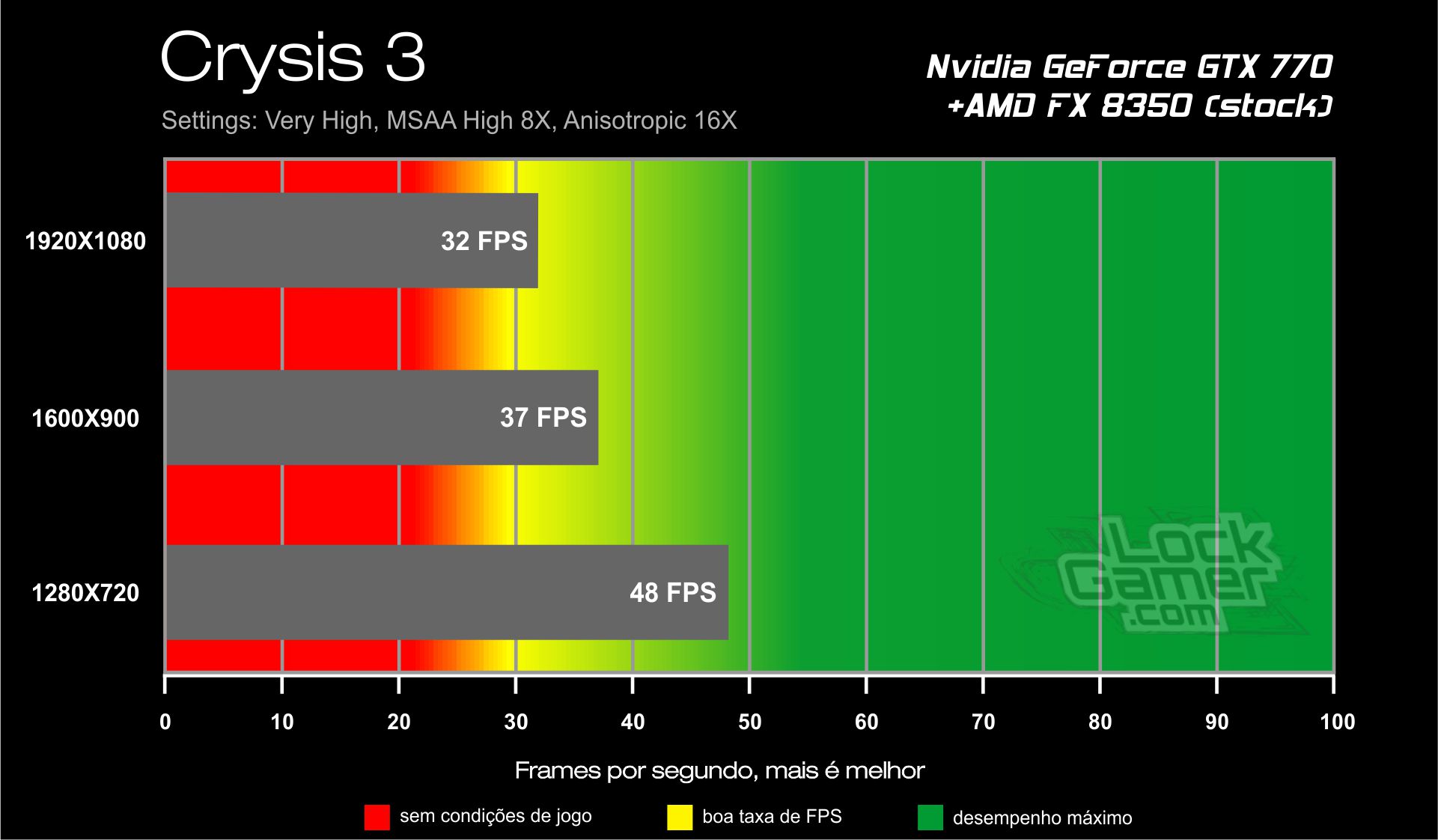 Entendemos que a média mínima de FPS aceitável para que a experiência de jogo não seja prejudicada é de 25 FPS, abaixo disso se torna praticamente impossível jogar, mas você deve prestar muita atenção antes de julgar o desempenho do produto testado, pois mesmo quando ele não é capaz de obter uma média acima de 25 FPS não significa que o desempenho foi ruim pois as placas de baixo custo, por exemplo, nem sempre são desenvolvidas para rodar os jogos em altas resoluções ou com detalhes no máximo e sacrificam um pouco do desempenho em favor do baixo custo.