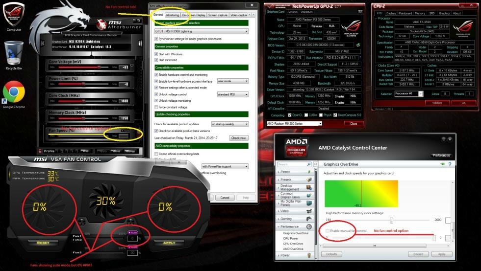 Um problema no mínimo “desagradável” tem sido relatado por usuários do modelo Lightining Radeon R9 290X da MSI, um possível bug no driver está causando o superaquecimento. O relato de um do leitor do site Wccftech se seguiu de várias reclamações de outros usuários com o mesmo problema que simplesmente desabilita as duas fans laterais da placa e limita a rotação da fan central a 30% causando o desligamento do sistema e gerando um risco real de queimar a GPU caso o processo se repita seguidas vezes já que não há refrigeração suficiente.