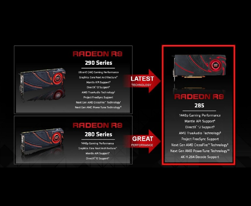 A coisa fica realmente interessante quando olhamos para as especificações de cada placa, a primeira vista se vê uma R9 285 inferior a antecessora mas os resultados dos primeiros reviews desmentem isso, na verdade ela se sai melhor em 1920×1080 e é ainda mais eficiente em 2560×1440 onde chega mesmo a encostar na R9 280X. Além do desempenho a R9 285 traz novas tecnologias como AMD TrueAudio, FreeSync, AMD PowerTune, 4K H264 Decode Support e a nova geração de CrossFire sem necessidade de pontes, sem esquecer do suporte a API Mantle e DirectX 12.