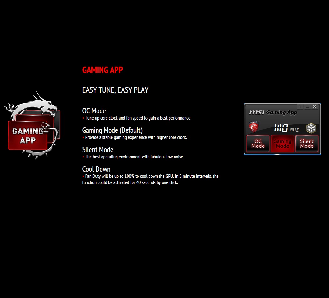 Assim como acontece na MSI R9 285 Gaming 2G que testamos, as novas GTX 970 e GTX 980 Gaming 4G possuem suporte ao MSI Gaming APP que permite aos jogadores alternar rapidamente entre perfis de Overclock(OC), Gaming e modos silenciosos, dependendo das necessidades do usuário.A novidade fica por conta do guia EyeRest, que lhe dá acesso rápido para perfis de cores do monitor específicas para jogos, filmes e um modo especial EyeRest, que reduz a luz azul, com a redução na emissão de luz azul, nosso corpo começa a se ajustar para o período noturno, tornando mais fácil seu relaxamento e descanso após longas sessões de jogo.