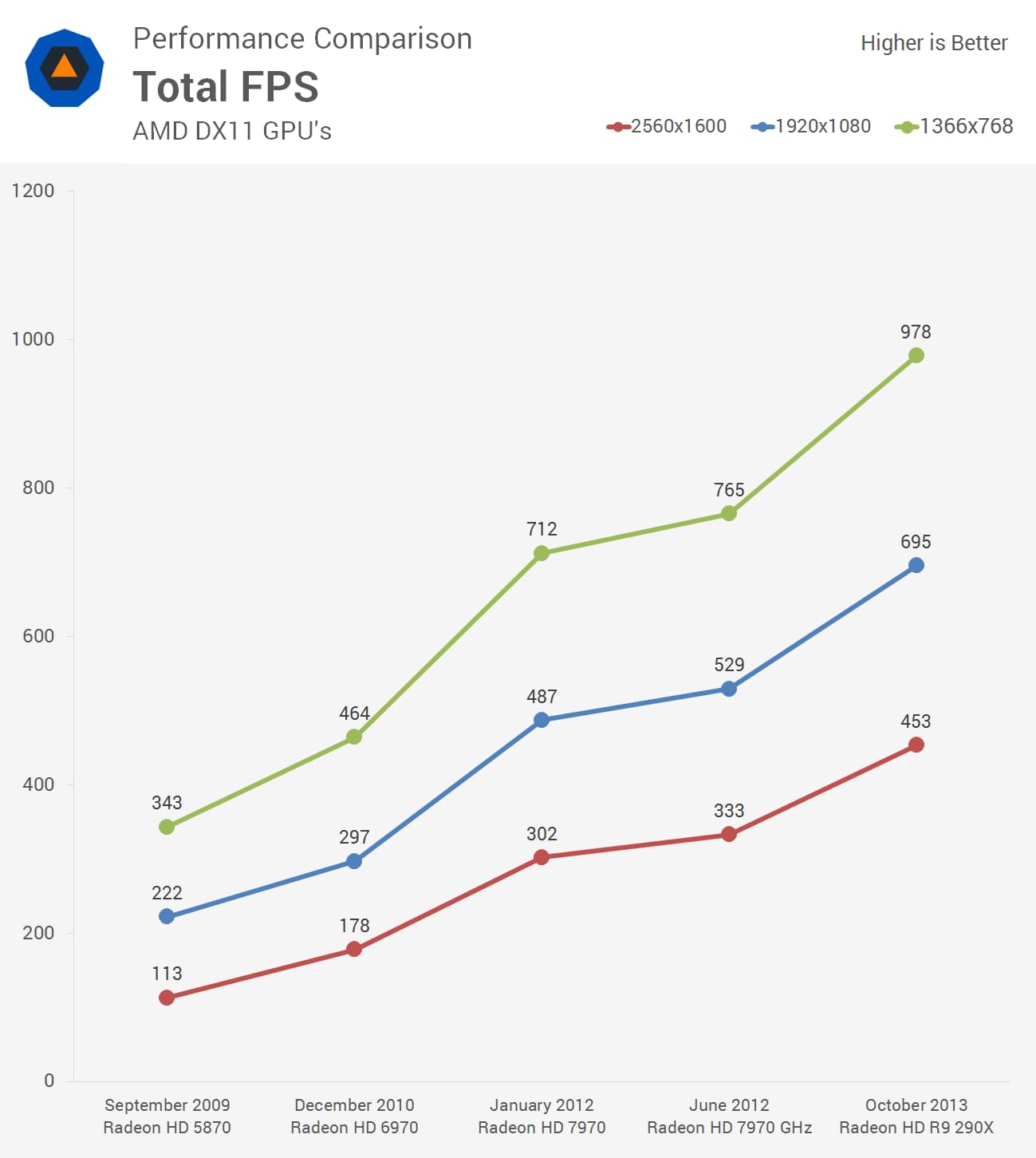 Os modelos utilizados foram HD 5870 (Evergreen), HD 6970 (Northern Islands), HD 7970 (Southern Islands) e R9 290X (Sea Islands) em três diferentes resoluções (1366×768, 1920×1080 e 2560×1600).