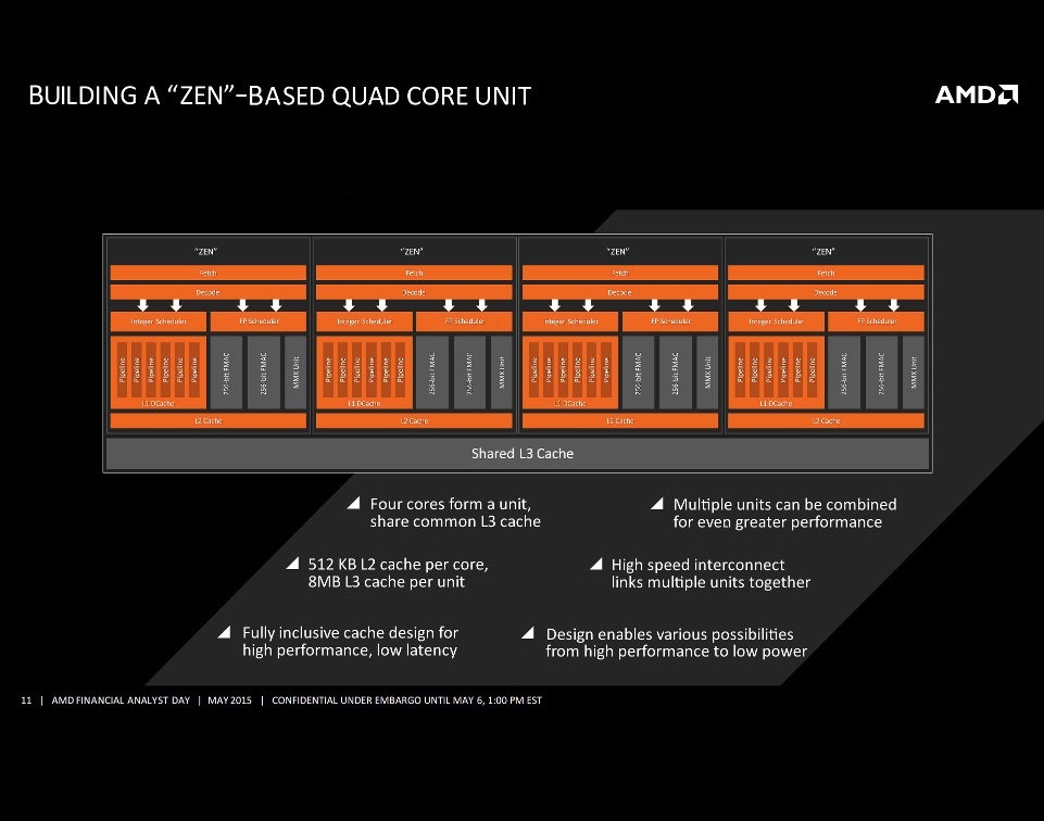 Tudo aponta para uma unificação da AMD que deve seguir o caminho da Intel com apenas uma arquitetura para as APUs, processadores tradicionais e até para servidores. Os diagramas mostram uma mudança total no projeto de seus processadores que aumentaria o desempenho de apenas um núcleo, além disso, é esperado um TDP entre 45W nos modelos mais “econômicos” e máximo de 95W nas APUs e FX de alto desempenho.