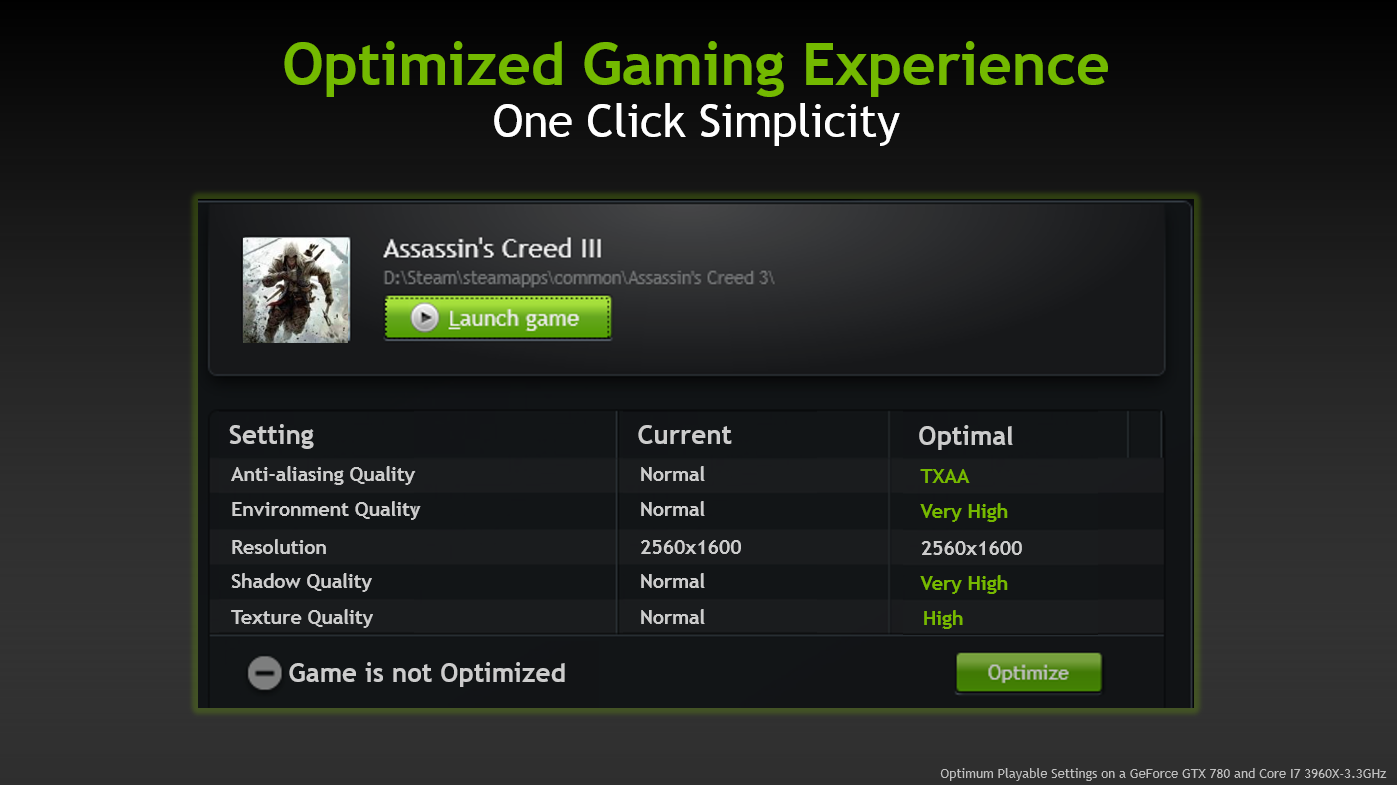 A mais notável das funções é sem dúvida nenhuma a de otimizar os jogos para o seu hardware sem que você precise perder horas seguidas mudando os detalhes do jogo, aumentando ou diminuindo algum filtro e medindo o FPS, o mais legal é que as configurações são sugeridas pela própria Nvidia tem uma equipe trabalhando para testar as mais diversas combinações que possam obter o melhor desempenho com a placa de vídeo que você comprou.